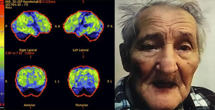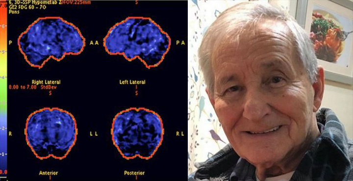Above:The before PET scan of a 75-year-old man with a 8-years history of cognitive difficulties shows prominent hypometabolism with a pattern suggestive of Alzheimer’s disease